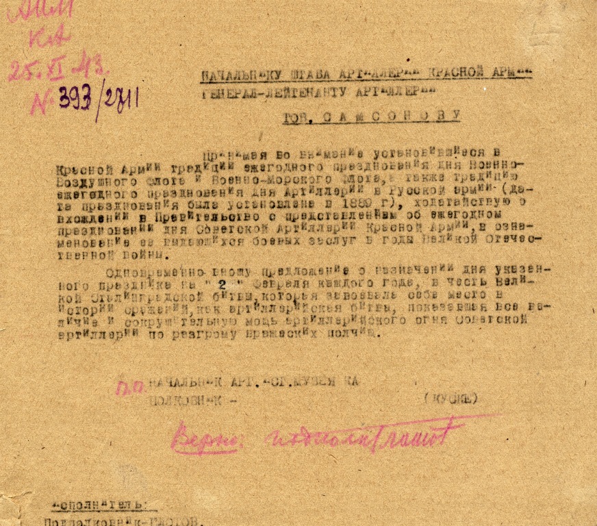 Изначально предлагалось отмечать этот праздник 2 февраля, в день окончания Сталинградской битвы, во время которой советская артиллерия показала свое величие и сокрушительную силу по разгрому вражеских полчищ.